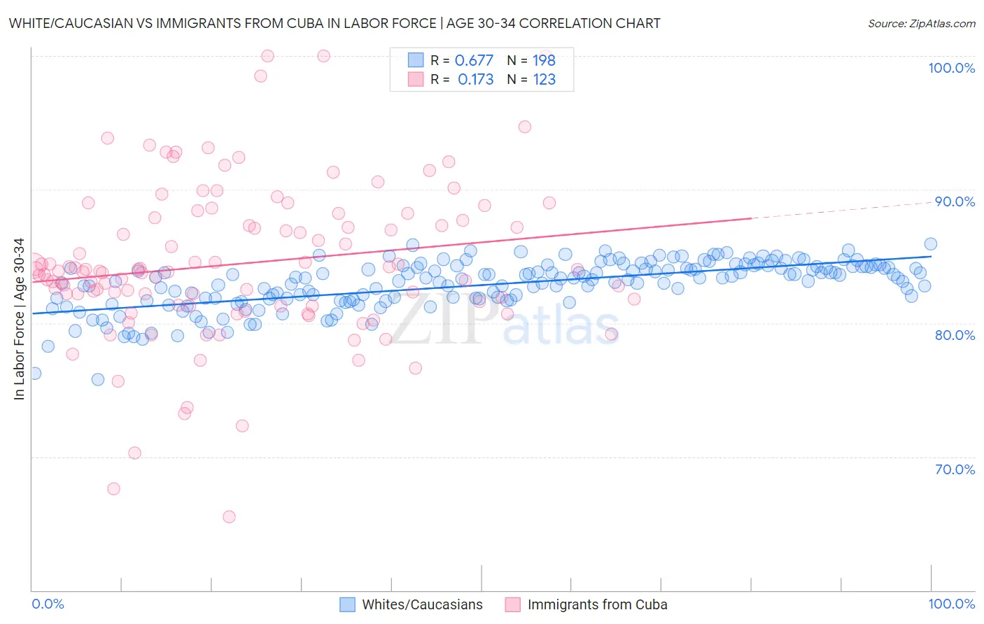 White/Caucasian vs Immigrants from Cuba In Labor Force | Age 30-34 Correlation Chart