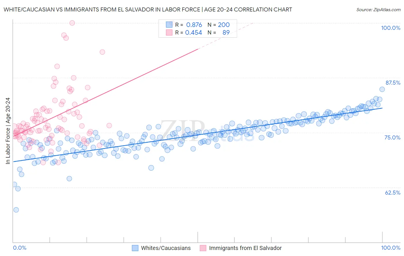 White/Caucasian vs Immigrants from El Salvador In Labor Force | Age 20-24 Correlation Chart