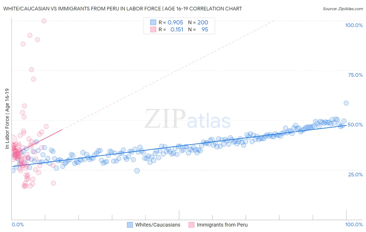 White/Caucasian vs Immigrants from Peru In Labor Force | Age 16-19 Correlation Chart