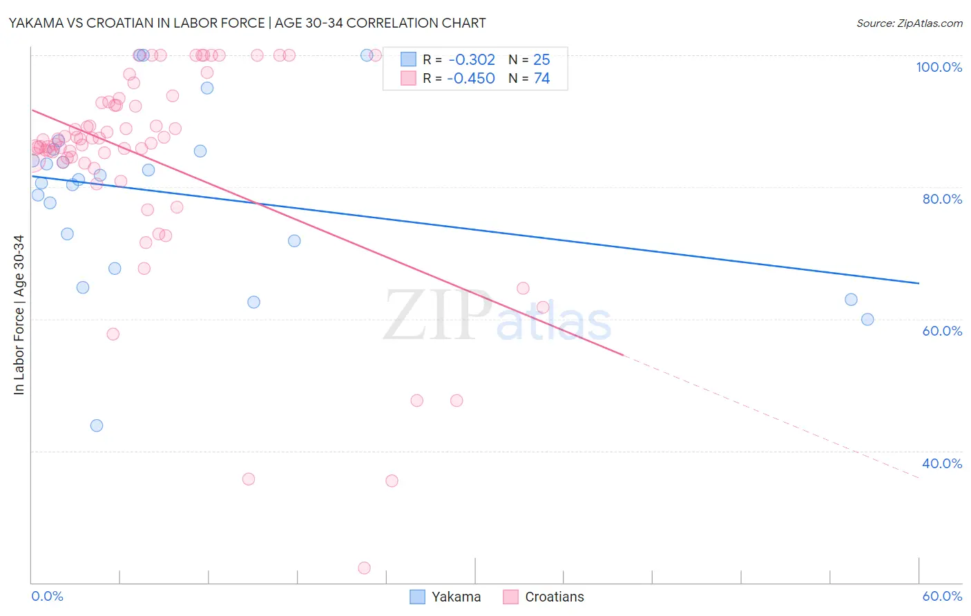 Yakama vs Croatian In Labor Force | Age 30-34 Correlation Chart