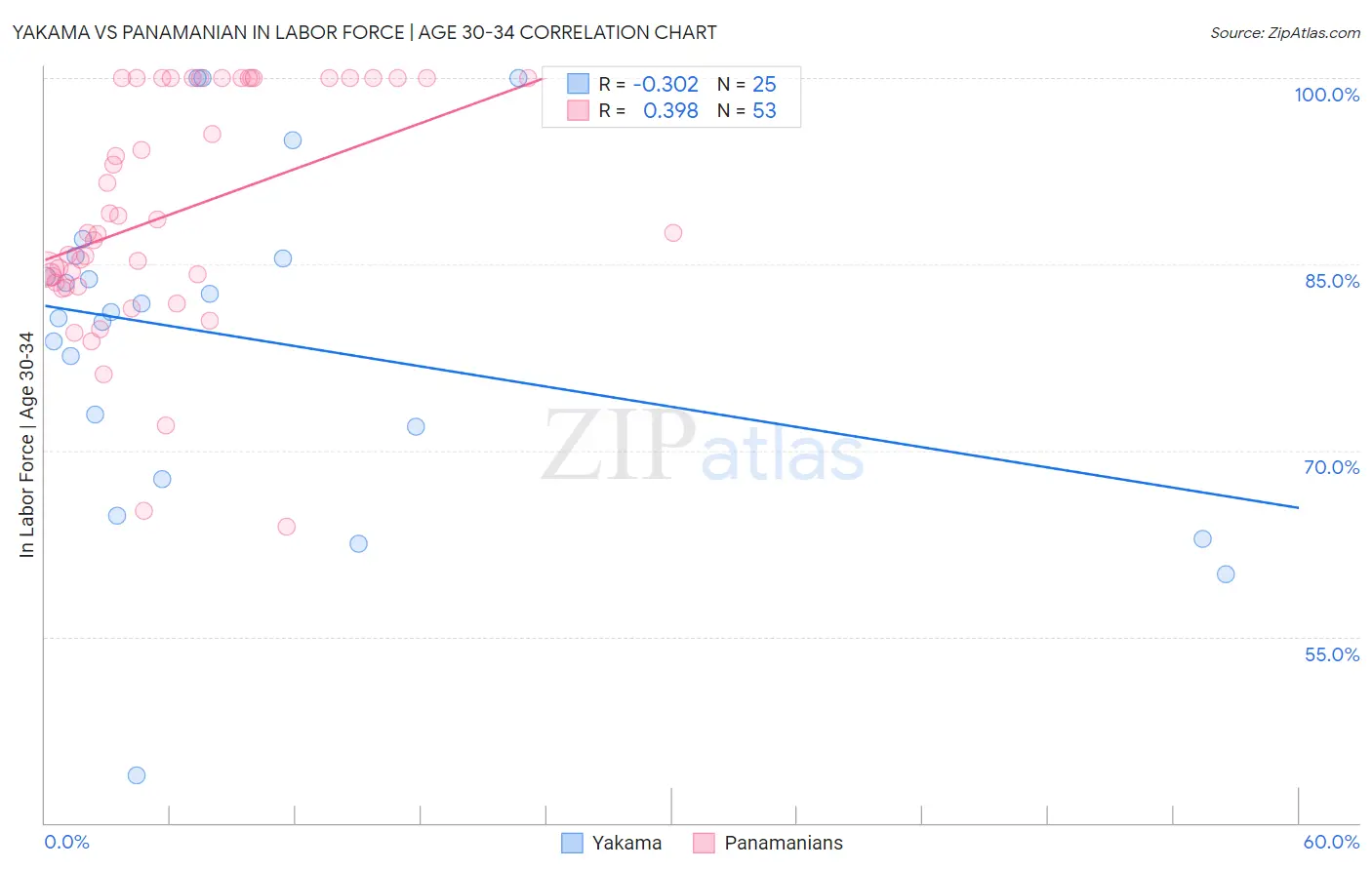 Yakama vs Panamanian In Labor Force | Age 30-34 Correlation Chart