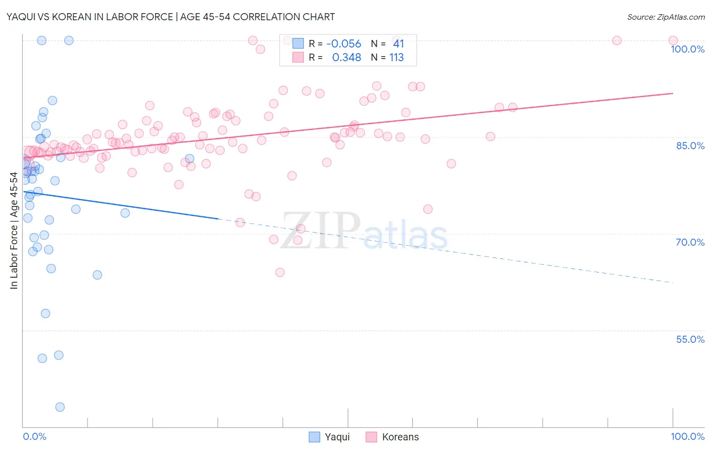 Yaqui vs Korean In Labor Force | Age 45-54 Correlation Chart