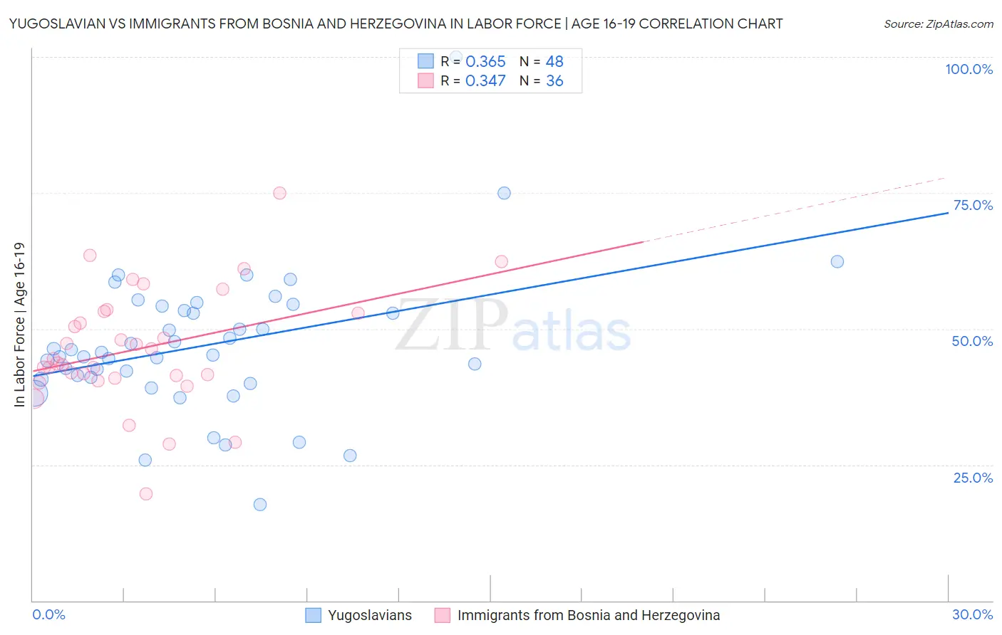 Yugoslavian vs Immigrants from Bosnia and Herzegovina In Labor Force | Age 16-19 Correlation Chart