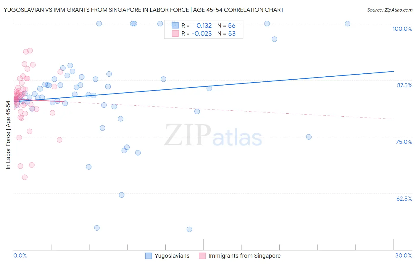 Yugoslavian vs Immigrants from Singapore In Labor Force | Age 45-54 Correlation Chart