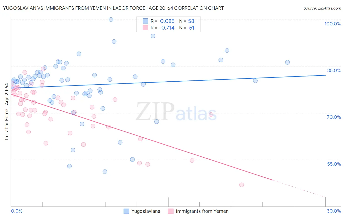 Yugoslavian vs Immigrants from Yemen In Labor Force | Age 20-64 Correlation Chart