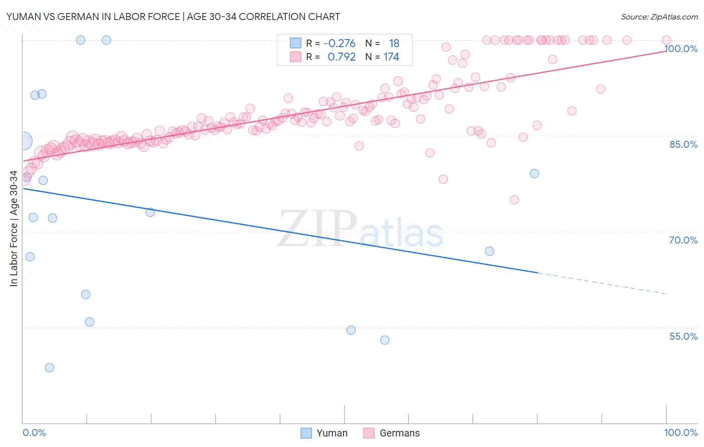 Yuman vs German In Labor Force | Age 30-34 Correlation Chart
