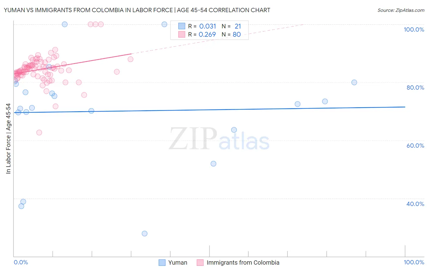 Yuman vs Immigrants from Colombia In Labor Force | Age 45-54 Correlation Chart