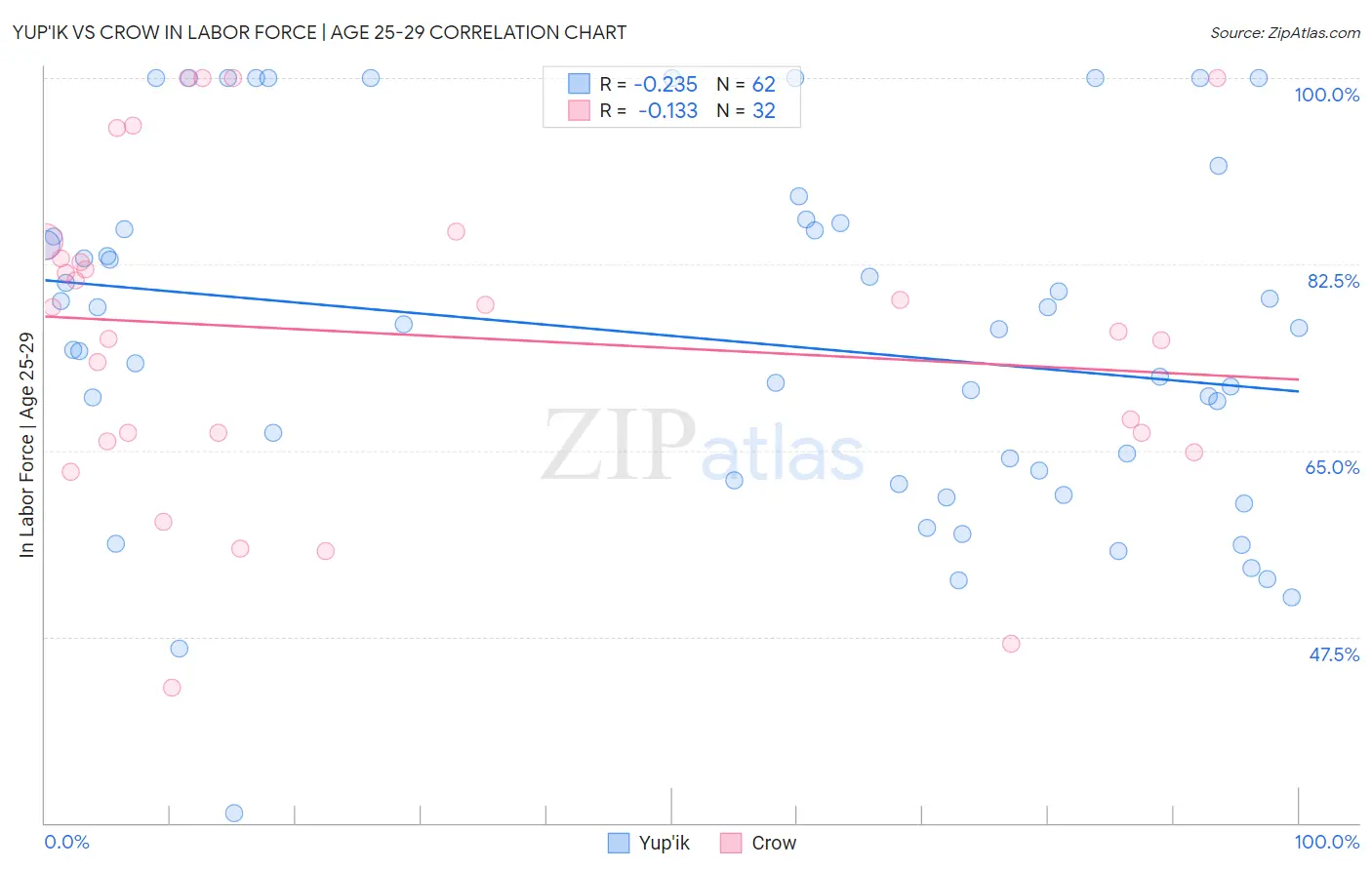 Yup'ik vs Crow In Labor Force | Age 25-29 Correlation Chart