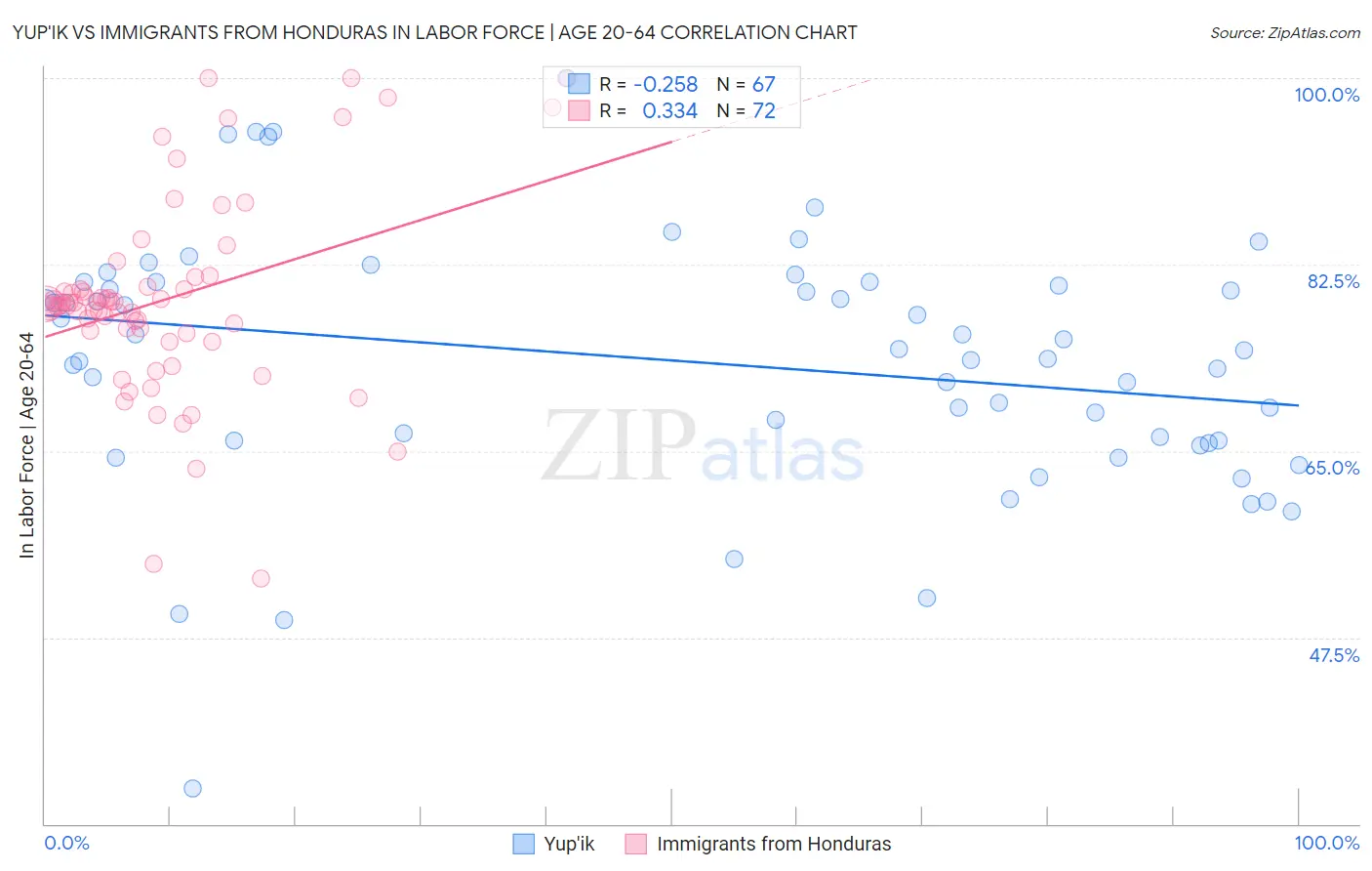 Yup'ik vs Immigrants from Honduras In Labor Force | Age 20-64 Correlation Chart