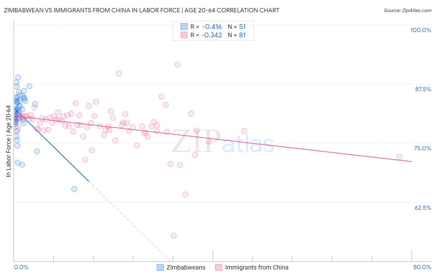 Zimbabwean vs Immigrants from China In Labor Force | Age 20-64 Correlation Chart