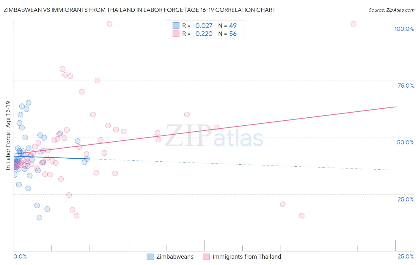 Zimbabwean vs Immigrants from Thailand In Labor Force | Age 16-19 Correlation Chart