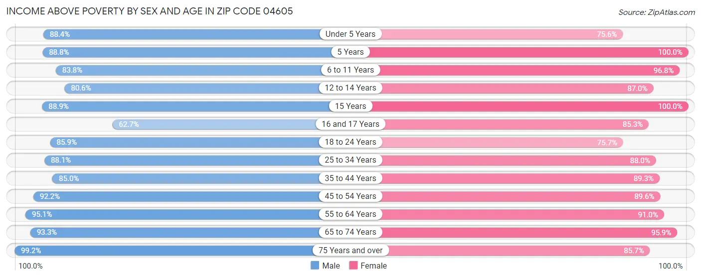 Income or Wage Gap in Zip Code 04605 is 13.4%.