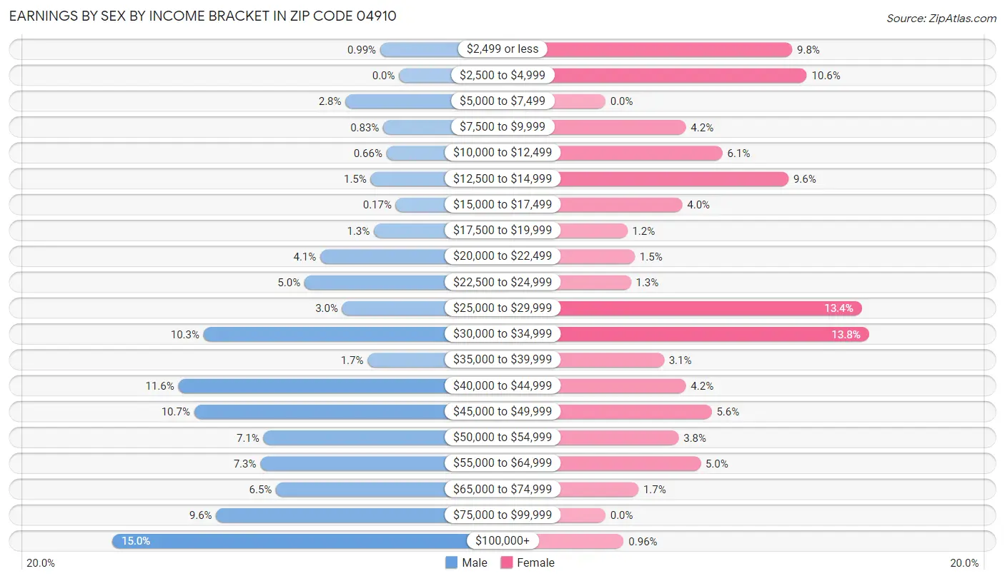 Earnings by Sex by Income Bracket in Zip Code 04910