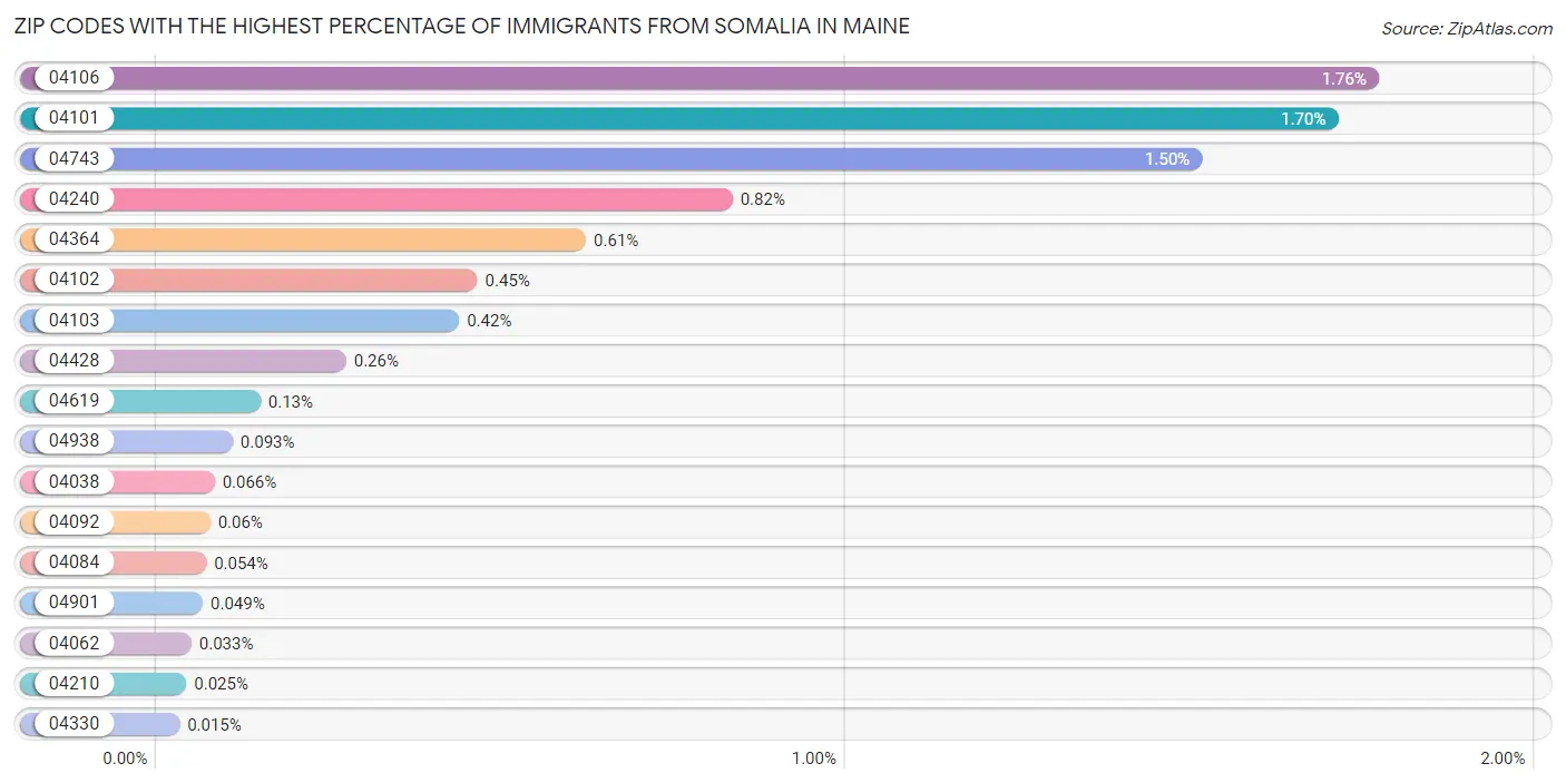 04101 has the Highest Percentage of Immigrants from Somalia in Maine with 2.06%.