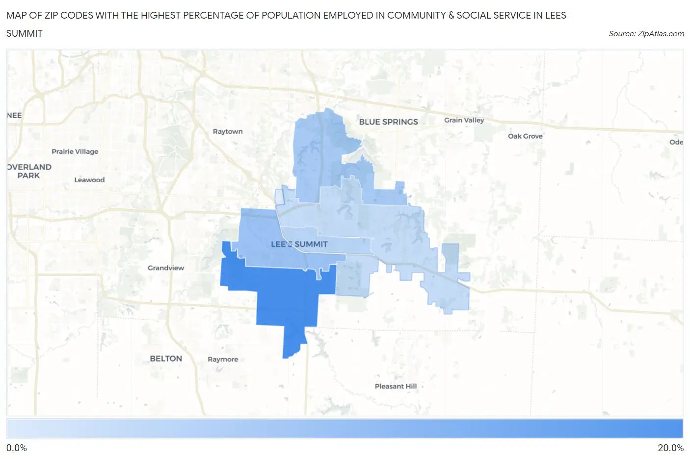 Map of Zip Codes with the Highest Percentage of Population Employed in Community & Social Service in Lees Summit