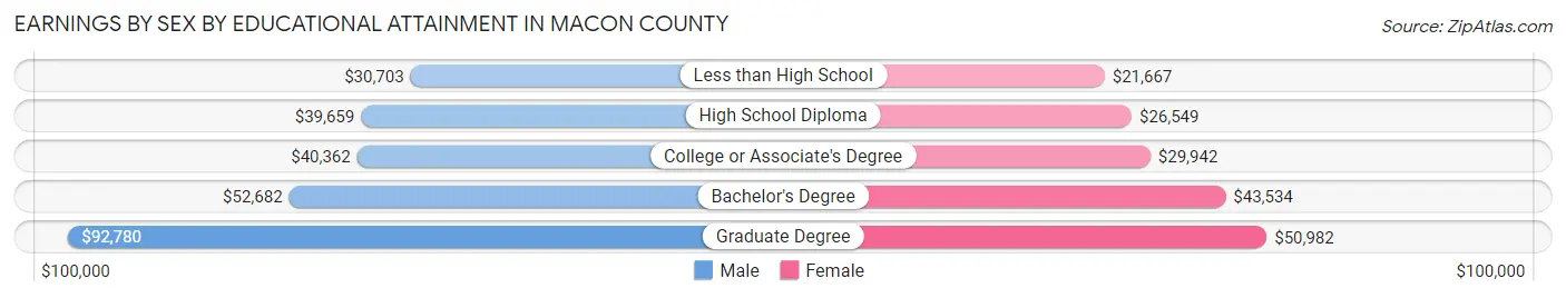 Average Earnings in Macon County are $34,129, $38,686 for men and $28,546 for women, a difference of 26.2%.
