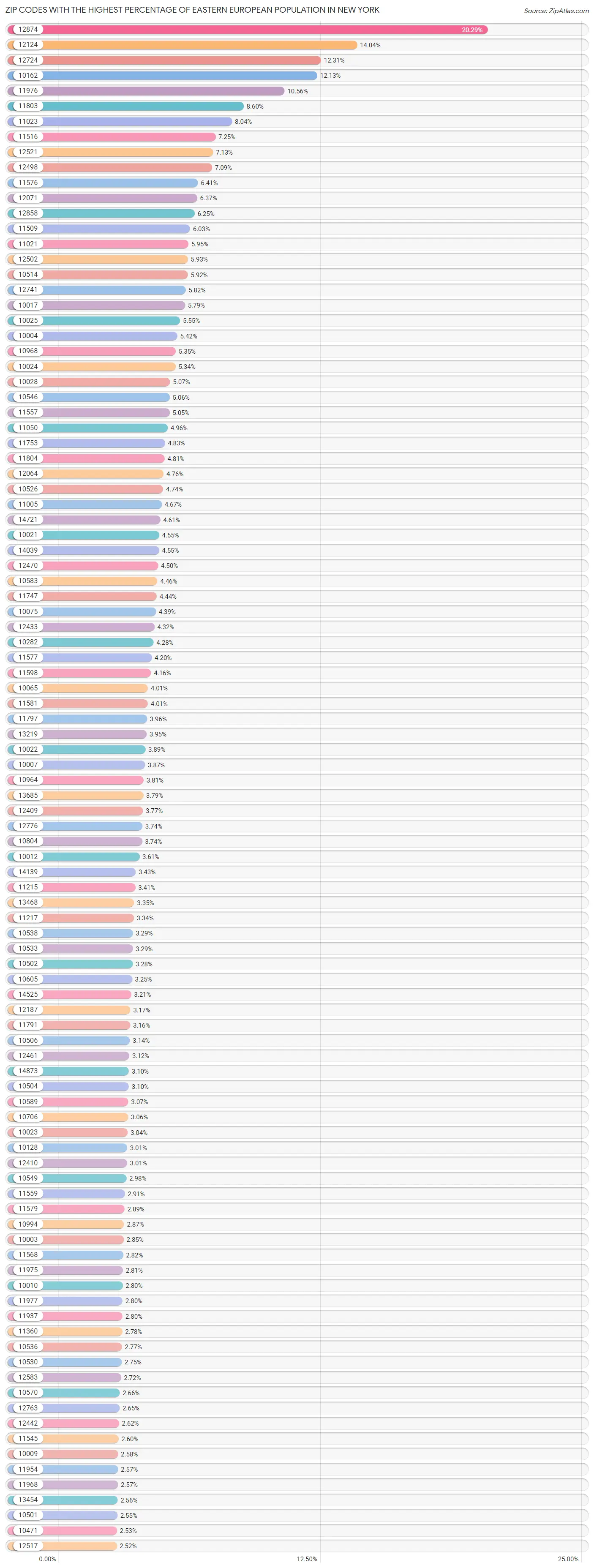 12874 has the Highest Percentage of Eastern European Population in New York with 18.06%.