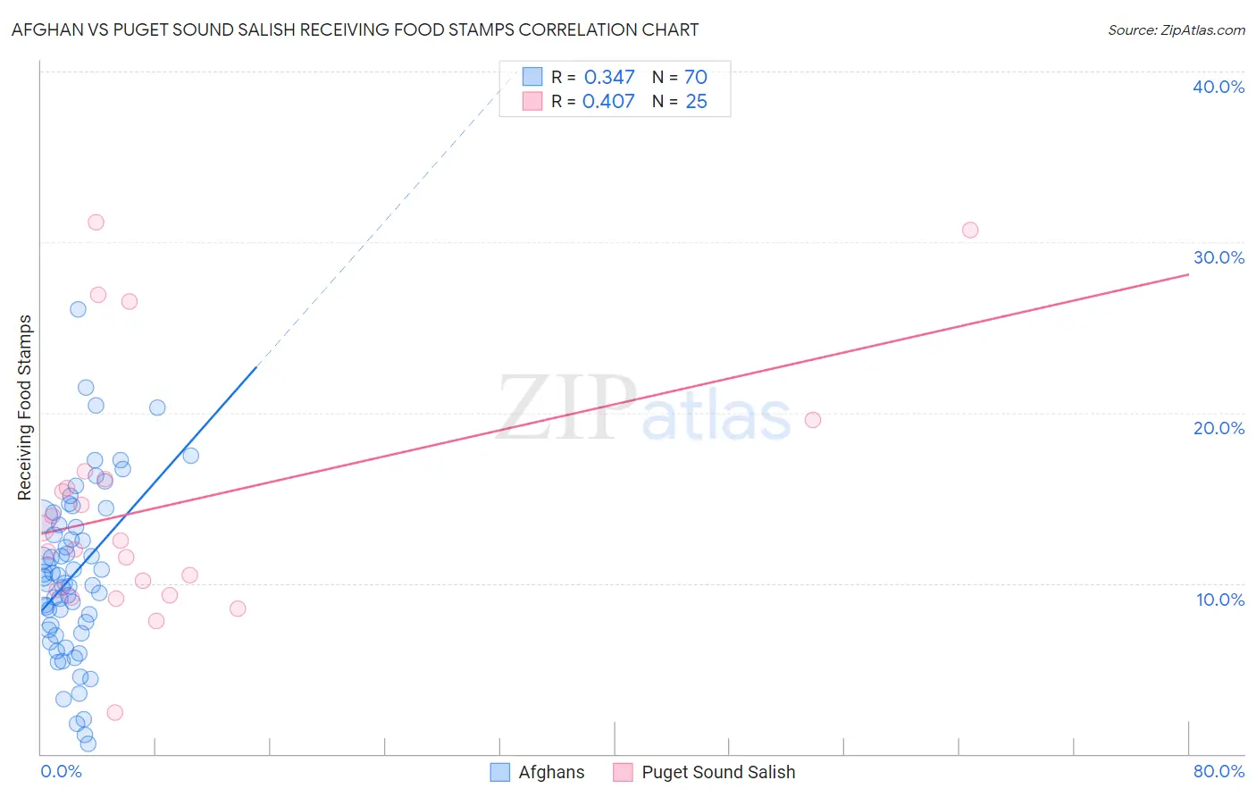 The statistical analysis conducted on geographies consisting of 148,722,422 people shows a mild positive correlation between the proportion of Afghans and percentage of population receiving government assistance and/or food stamps in the United States with a correlation coefficient (R) of 0.347 and weighted average of 10.7%. Similarly, the statistical analysis conducted on geographies consisting of 46,113,592 people shows a moderate positive correlation between the proportion of Puget Sound Salish and percentage of population receiving government assistance and/or food stamps in the United States with a correlation coefficient (R) of 0.407 and weighted average of 13.1%, a difference of 22.5%.