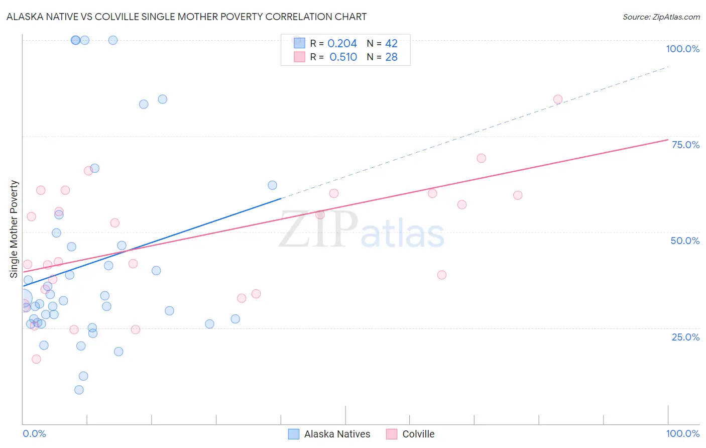 Alaska Native vs Colville Single Mother Poverty Correlation Chart