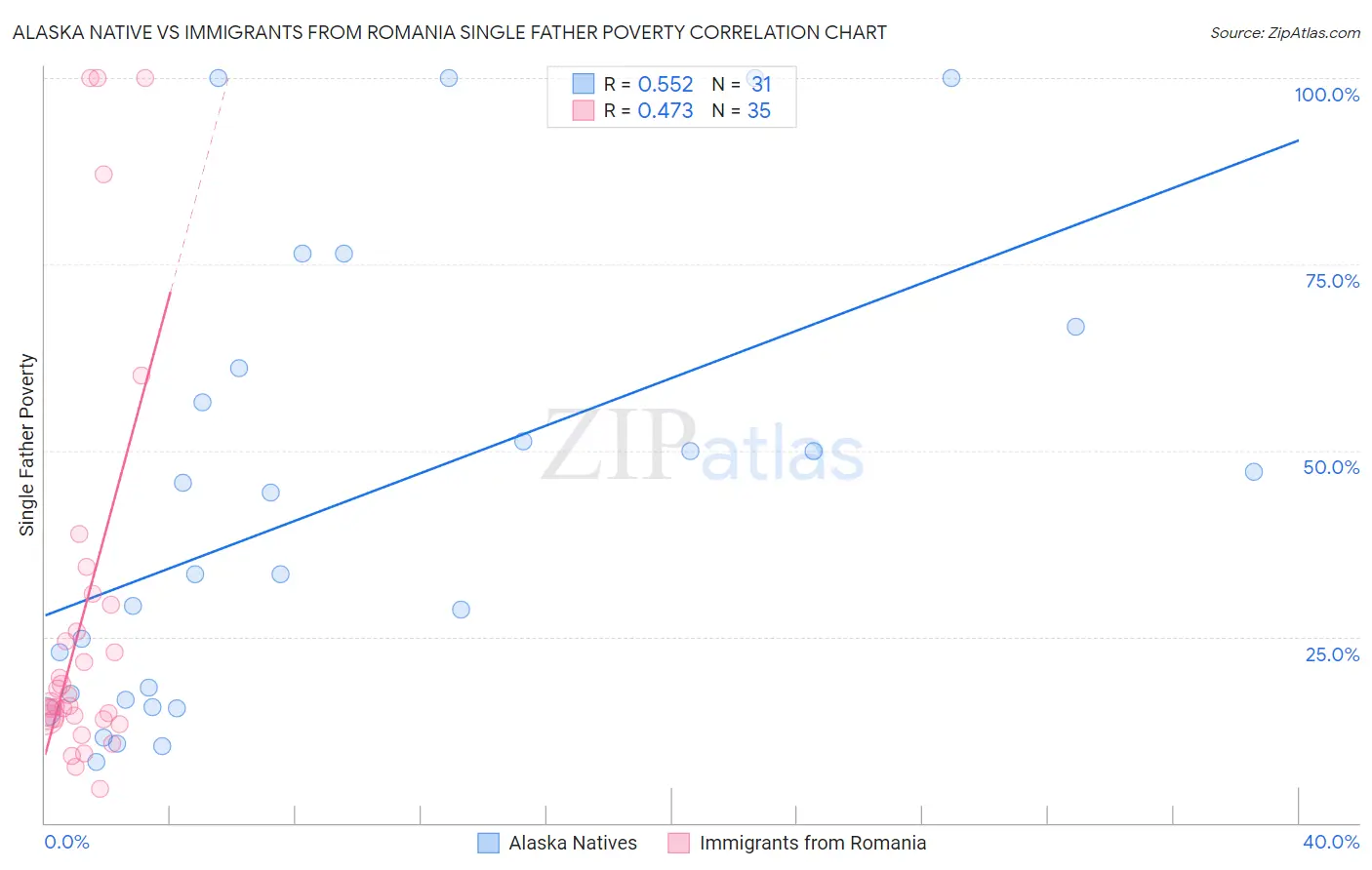 Alaska Native vs Immigrants from Romania Single Father Poverty Correlation Chart