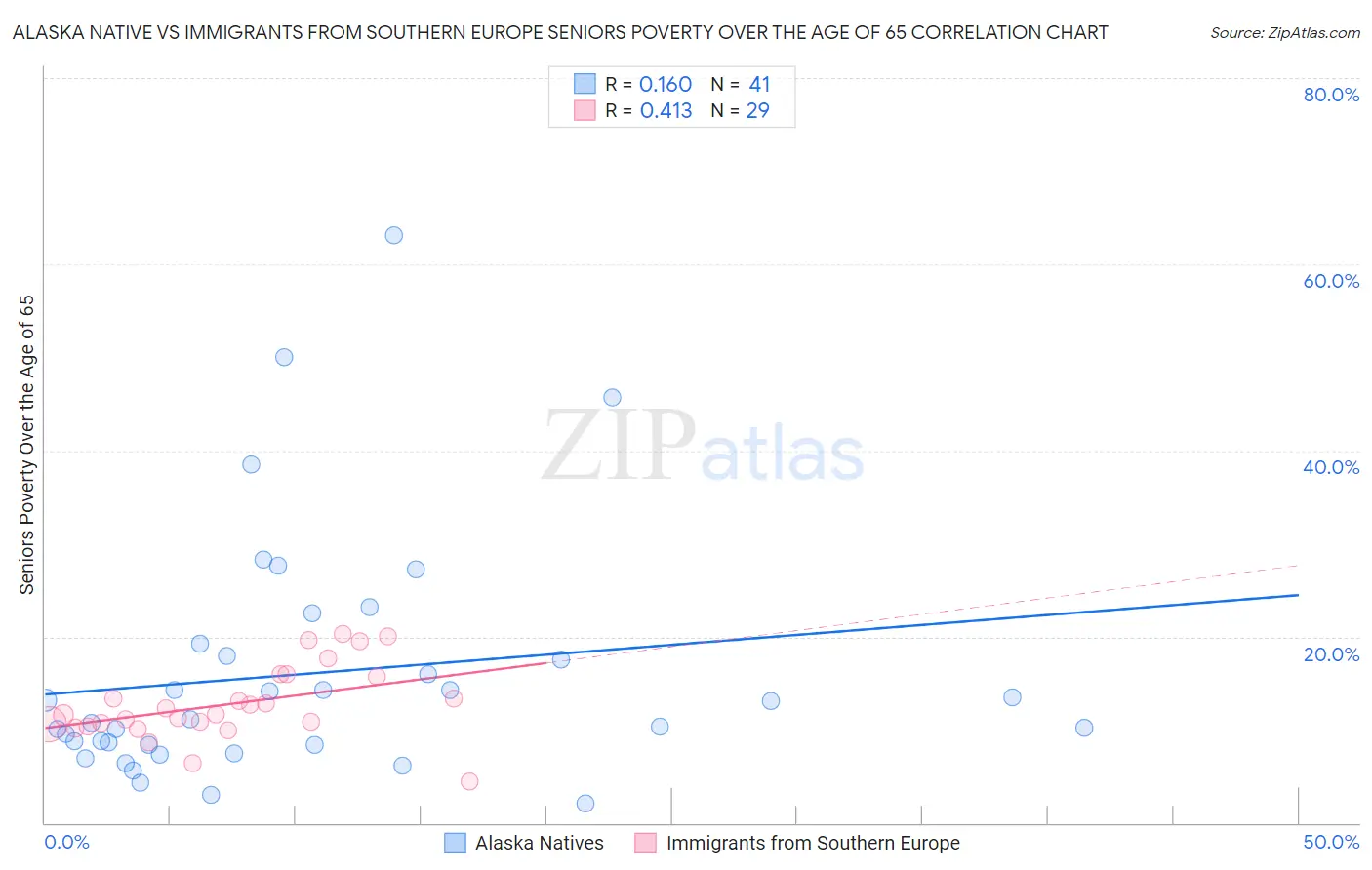 Alaska Native vs Immigrants from Southern Europe Seniors Poverty Over the Age of 65 Correlation Chart