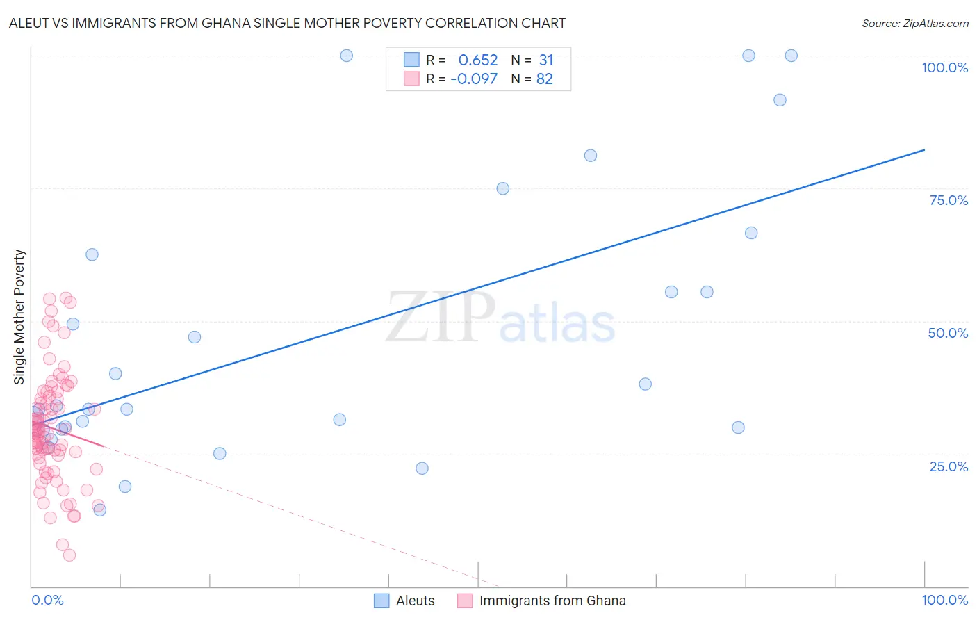 Aleut vs Immigrants from Ghana Single Mother Poverty Correlation Chart
