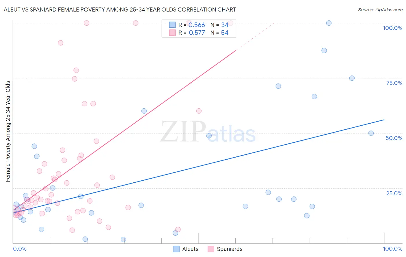 Aleut vs Spaniard Female Poverty Among 25-34 Year Olds Correlation Chart