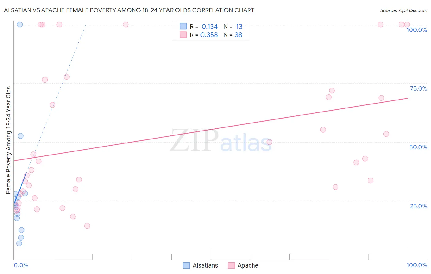 Alsatian vs Apache Female Poverty Among 18-24 Year Olds Correlation Chart