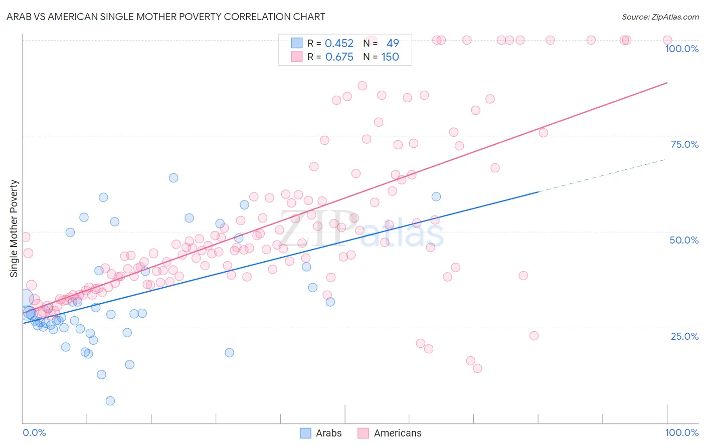 The statistical analysis conducted on geographies consisting of 470,668,307 people shows a moderate positive correlation between the proportion of Arabs and poverty level among single mothers in the United States with a correlation coefficient (R) of 0.452 and weighted average of 29.0%. Similarly, the statistical analysis conducted on geographies consisting of 551,658,648 people shows a significant positive correlation between the proportion of Americans and poverty level among single mothers in the United States with a correlation coefficient (R) of 0.675 and weighted average of 33.5%, a difference of 15.5%.