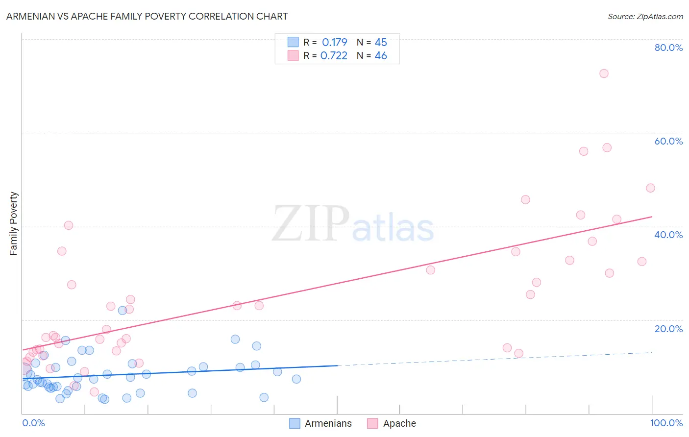 The statistical analysis conducted on geographies consisting of 310,074,733 people shows a poor positive correlation between the proportion of Armenians and poverty level among families in the United States with a correlation coefficient (R) of 0.179 and weighted average of 8.5%. Similarly, the statistical analysis conducted on geographies consisting of 230,899,358 people shows a strong positive correlation between the proportion of Apache and poverty level among families in the United States with a correlation coefficient (R) of 0.722 and weighted average of 14.7%, a difference of 73.4%.