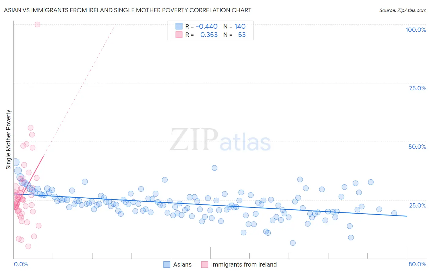 Asian vs Immigrants from Ireland Single Mother Poverty Correlation Chart