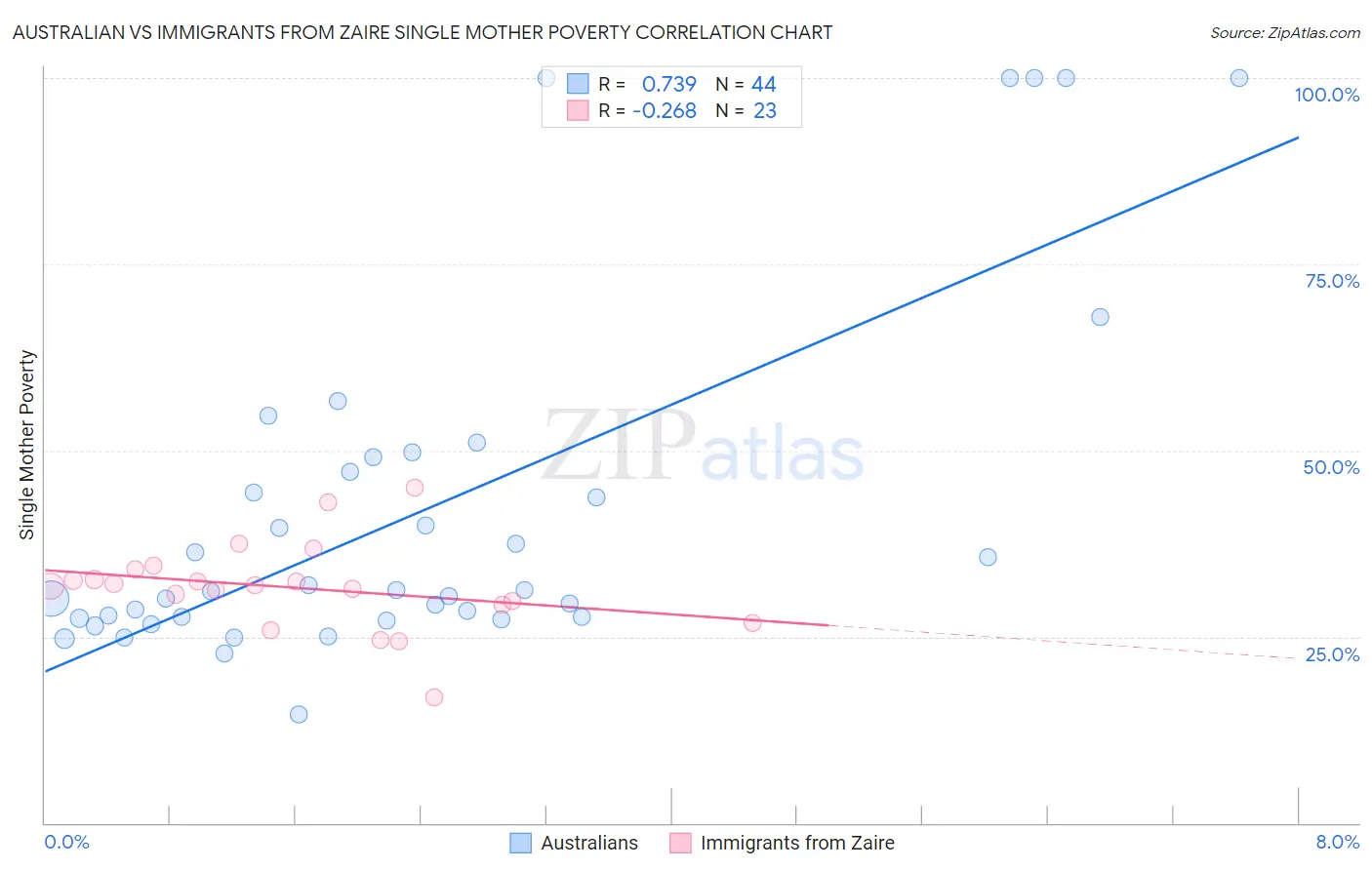 Australian vs Immigrants from Zaire Single Mother Poverty Correlation Chart