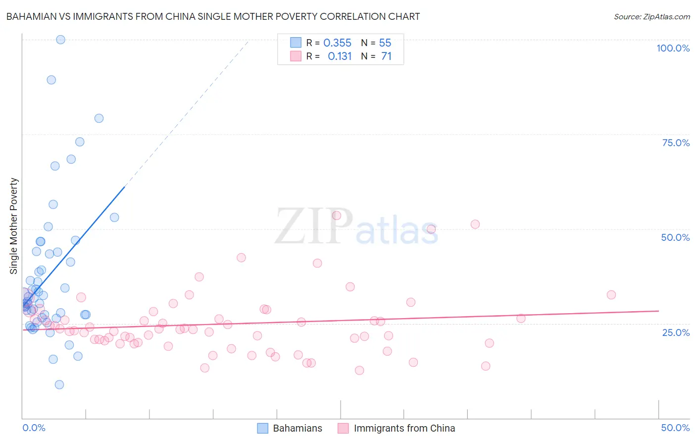 Bahamian vs Immigrants from China Single Mother Poverty Correlation Chart
