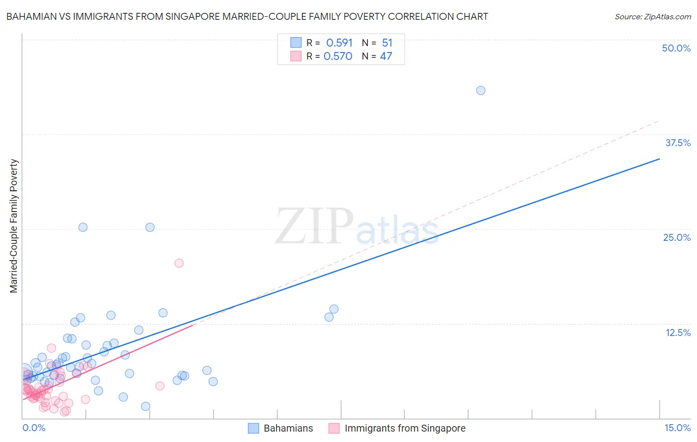 The statistical analysis conducted on geographies consisting of 112,412,919 people shows a substantial positive correlation between the proportion of Bahamians and poverty level among married-couple families in the United States with a correlation coefficient (R) of 0.591 and weighted average of 6.6%. Similarly, the statistical analysis conducted on geographies consisting of 136,997,668 people shows a substantial positive correlation between the proportion of Immigrants from Singapore and poverty level among married-couple families in the United States with a correlation coefficient (R) of 0.570 and weighted average of 4.1%, a difference of 61.7%.