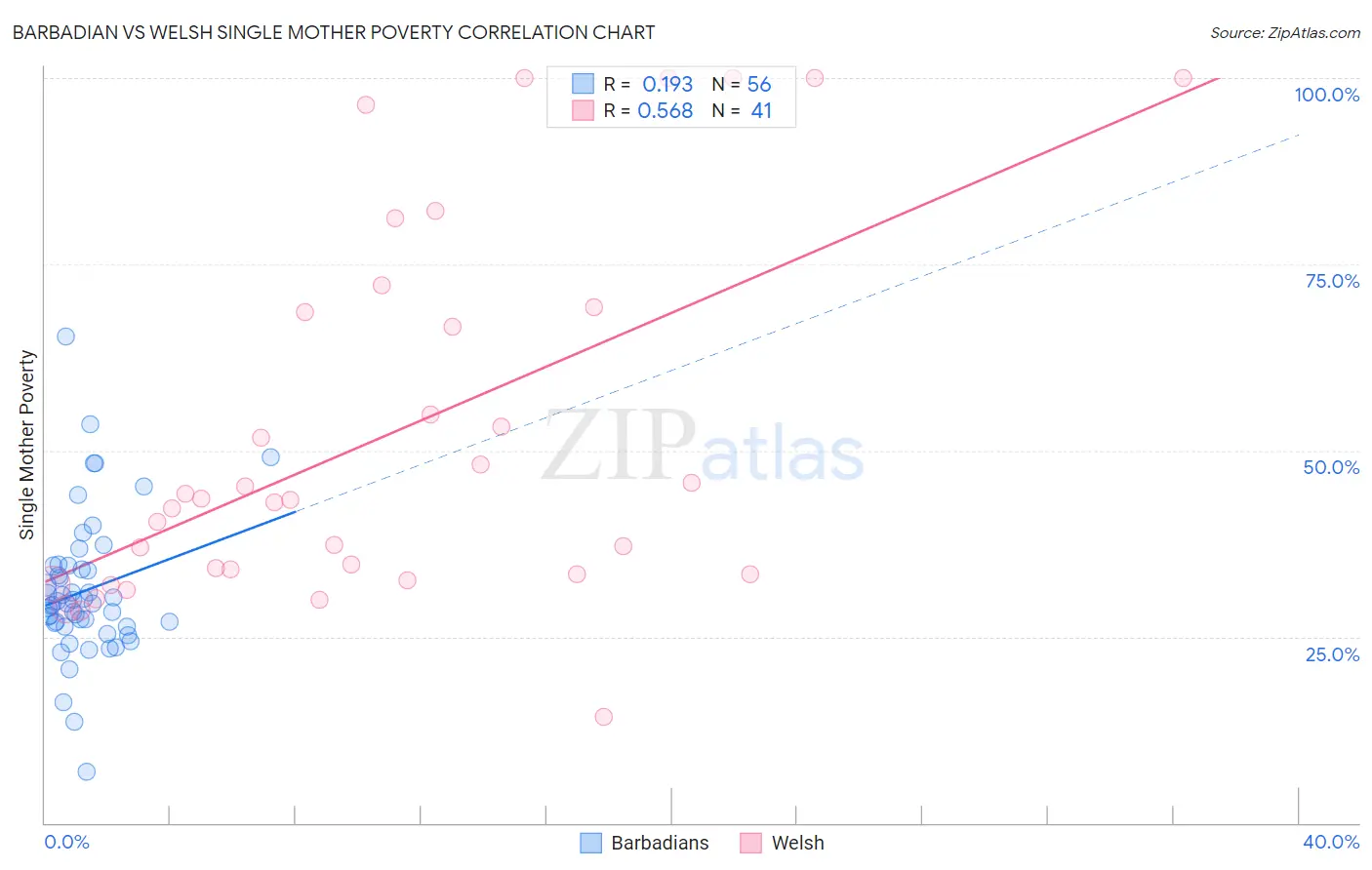 The statistical analysis conducted on geographies consisting of 140,210,705 people shows a poor positive correlation between the proportion of Barbadians and poverty level among single mothers in the United States with a correlation coefficient (R) of 0.193 and weighted average of 30.7%. Similarly, the statistical analysis conducted on geographies consisting of 506,398,542 people shows a substantial positive correlation between the proportion of Welsh and poverty level among single mothers in the United States with a correlation coefficient (R) of 0.568 and weighted average of 30.4%, a difference of 1.0%.