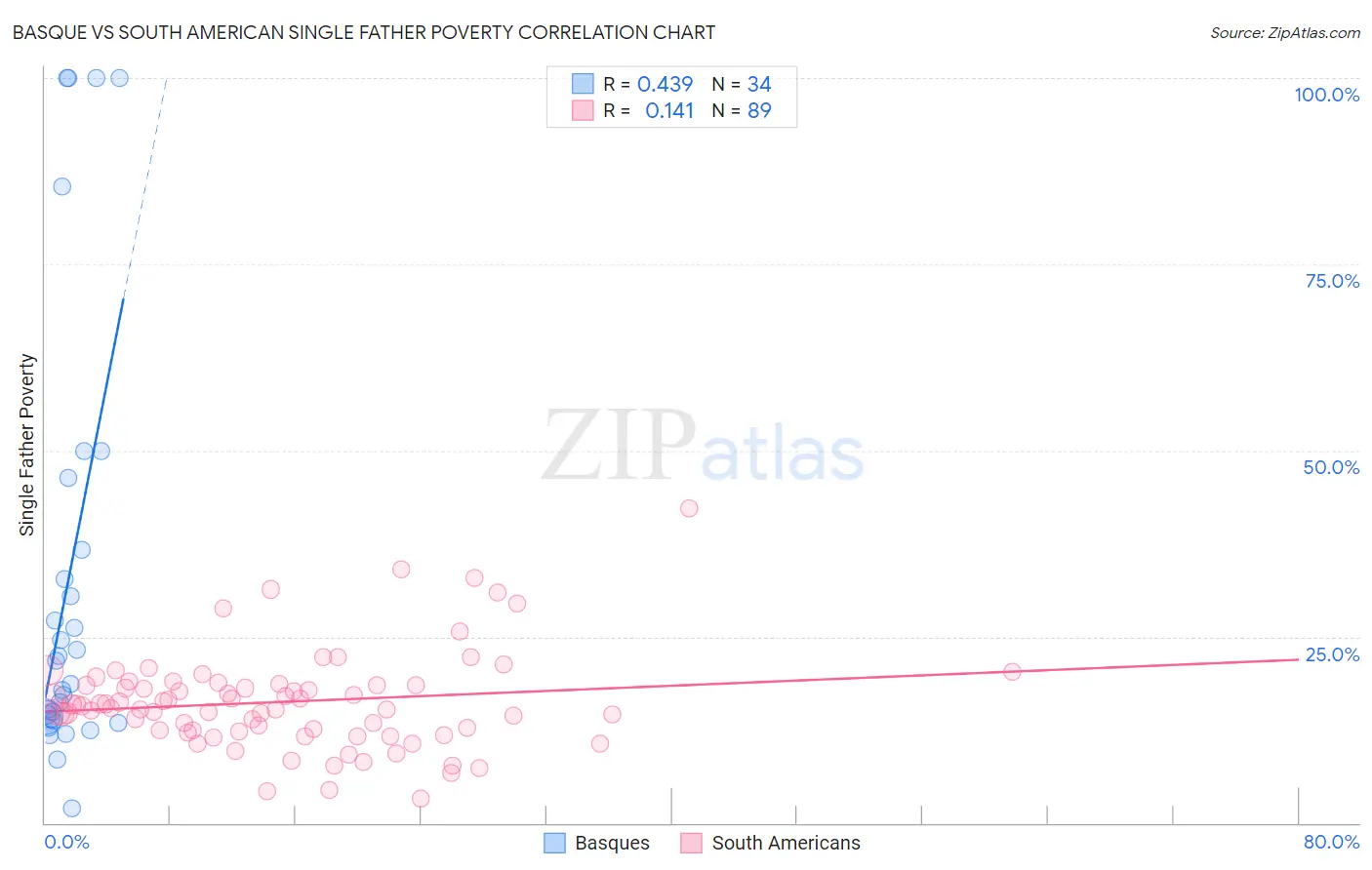 The statistical analysis conducted on geographies consisting of 144,984,159 people shows a moderate positive correlation between the proportion of Basques and poverty level among single fathers in the United States with a correlation coefficient (R) of 0.439 and weighted average of 15.5%. Similarly, the statistical analysis conducted on geographies consisting of 374,519,857 people shows a poor positive correlation between the proportion of South Americans and poverty level among single fathers in the United States with a correlation coefficient (R) of 0.141 and weighted average of 16.0%, a difference of 2.7%.