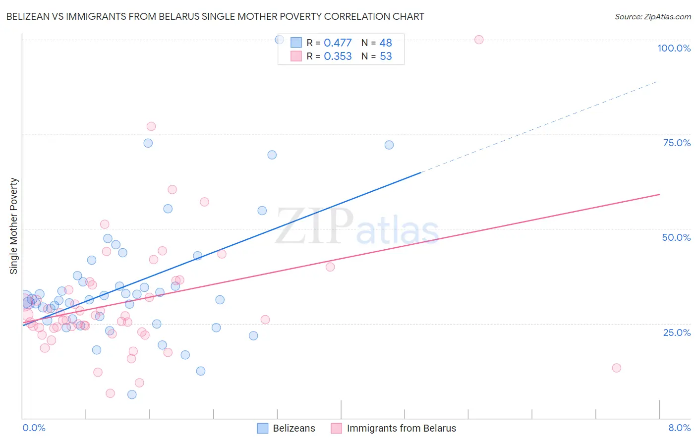 Belizean vs Immigrants from Belarus Single Mother Poverty Correlation Chart