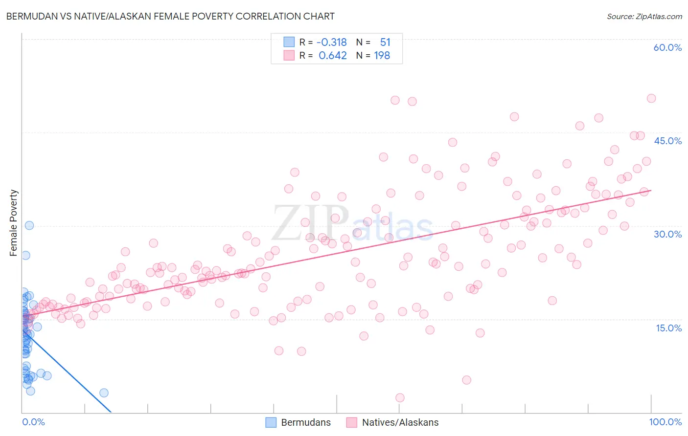 Bermudan vs Native/Alaskan Female Poverty Correlation Chart