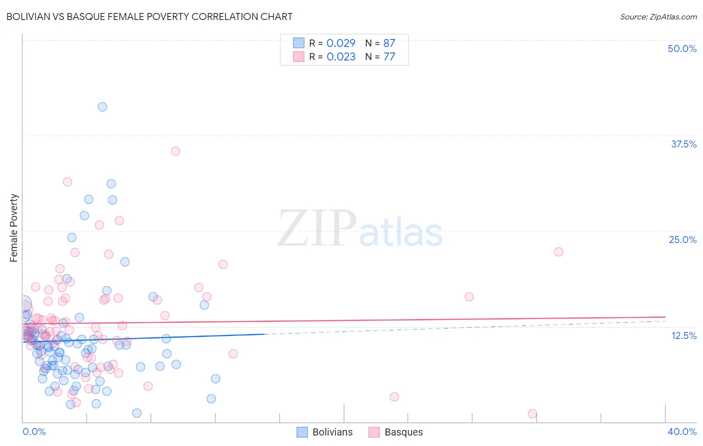 The statistical analysis conducted on geographies consisting of 184,615,505 people shows no correlation between the proportion of Bolivians and poverty level among females in the United States with a correlation coefficient (R) of 0.029 and weighted average of 11.5%. Similarly, the statistical analysis conducted on geographies consisting of 165,726,735 people shows no correlation between the proportion of Basques and poverty level among females in the United States with a correlation coefficient (R) of 0.023 and weighted average of 12.9%, a difference of 12.5%.