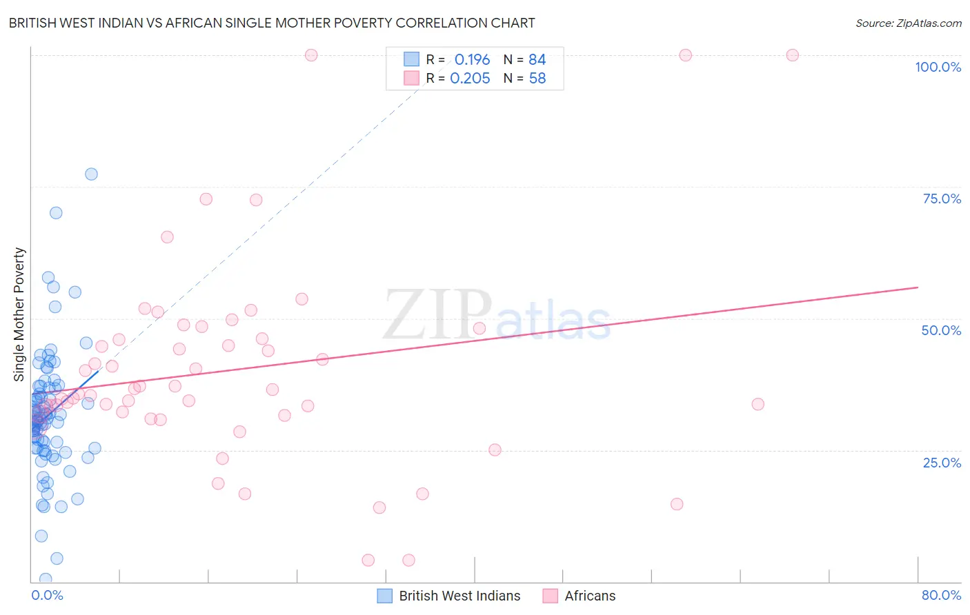 The statistical analysis conducted on geographies consisting of 151,437,686 people shows a poor positive correlation between the proportion of British West Indians and poverty level among single mothers in the United States with a correlation coefficient (R) of 0.196 and weighted average of 31.5%. Similarly, the statistical analysis conducted on geographies consisting of 460,032,526 people shows a weak positive correlation between the proportion of Africans and poverty level among single mothers in the United States with a correlation coefficient (R) of 0.205 and weighted average of 33.3%, a difference of 5.7%.