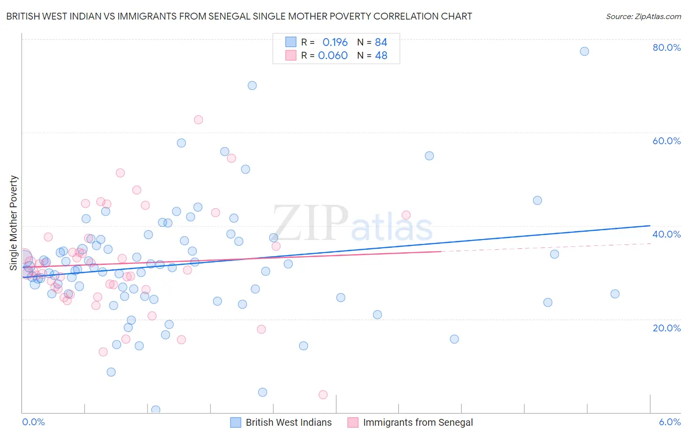 British West Indian vs Immigrants from Senegal Single Mother Poverty Correlation Chart