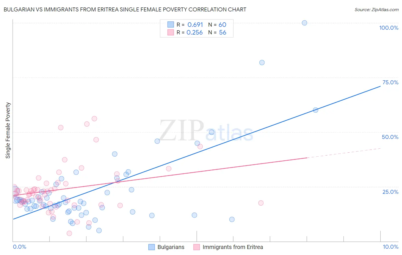 Bulgarian vs Immigrants from Eritrea Single Female Poverty Correlation Chart