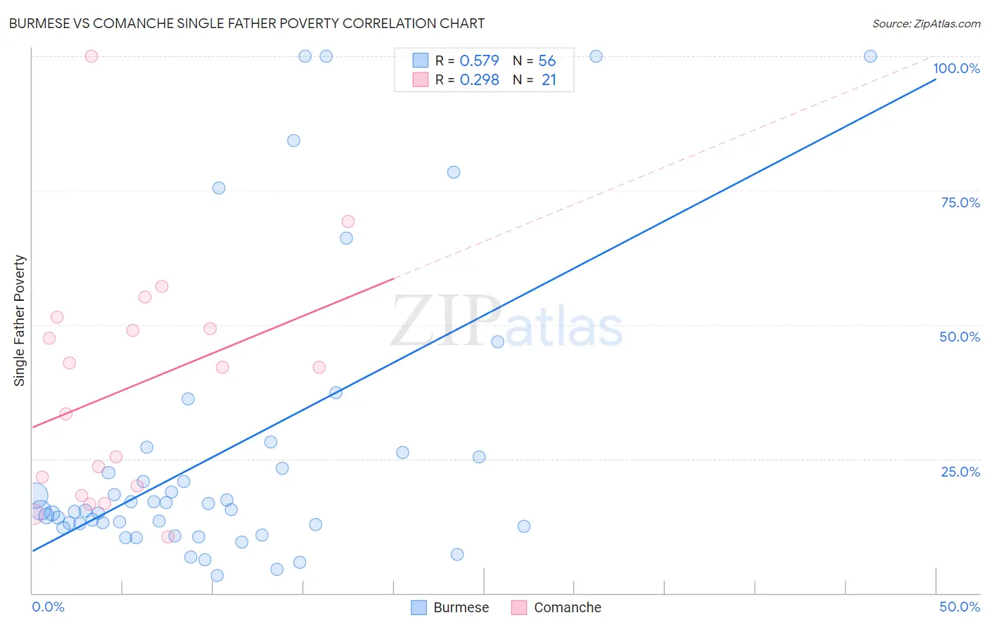 Burmese vs Comanche Single Father Poverty Correlation Chart