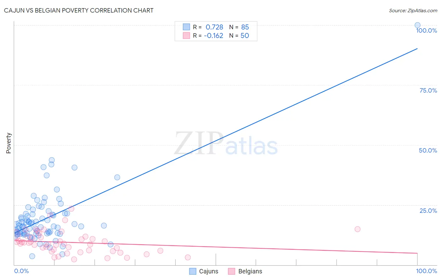The statistical analysis conducted on geographies consisting of 149,691,994 people shows a strong positive correlation between the proportion of Cajuns and poverty level in the United States with a correlation coefficient (R) of 0.728 and weighted average of 15.7%. Similarly, the statistical analysis conducted on geographies consisting of 355,864,059 people shows a poor negative correlation between the proportion of Belgians and poverty level in the United States with a correlation coefficient (R) of -0.162 and weighted average of 11.4%, a difference of 38.0%.