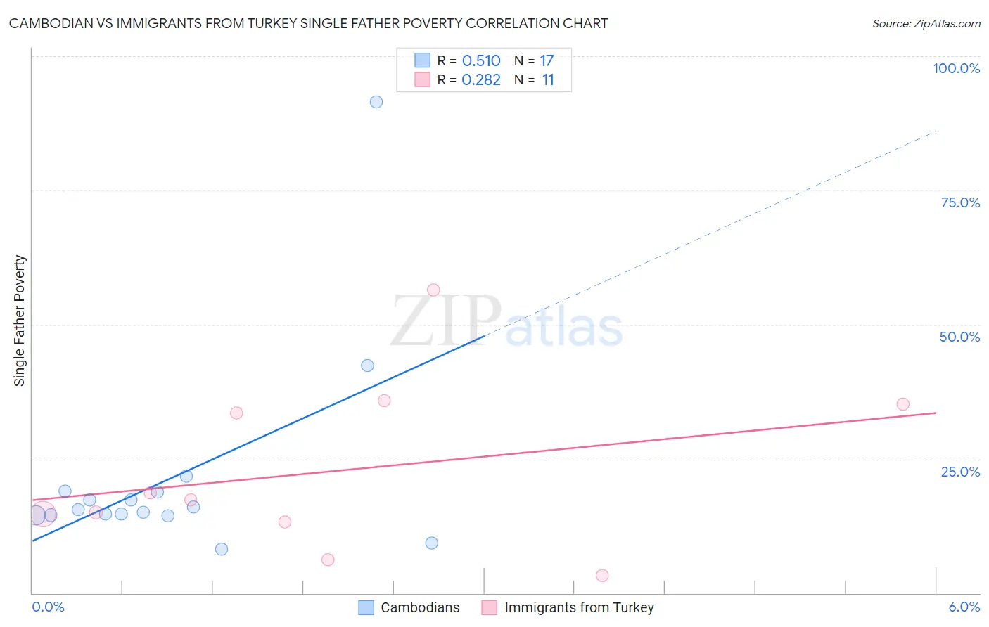 Cambodian vs Immigrants from Turkey Single Father Poverty Correlation Chart
