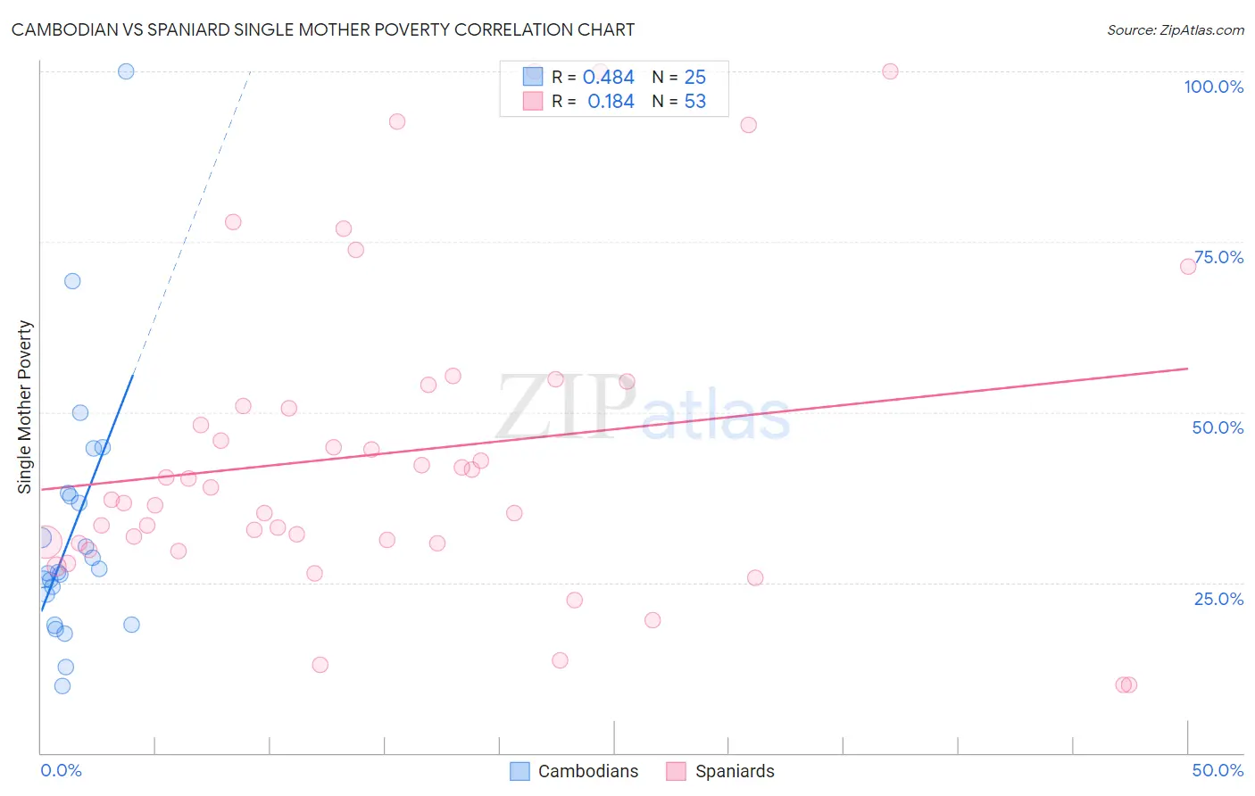 Cambodian vs Spaniard Single Mother Poverty Correlation Chart