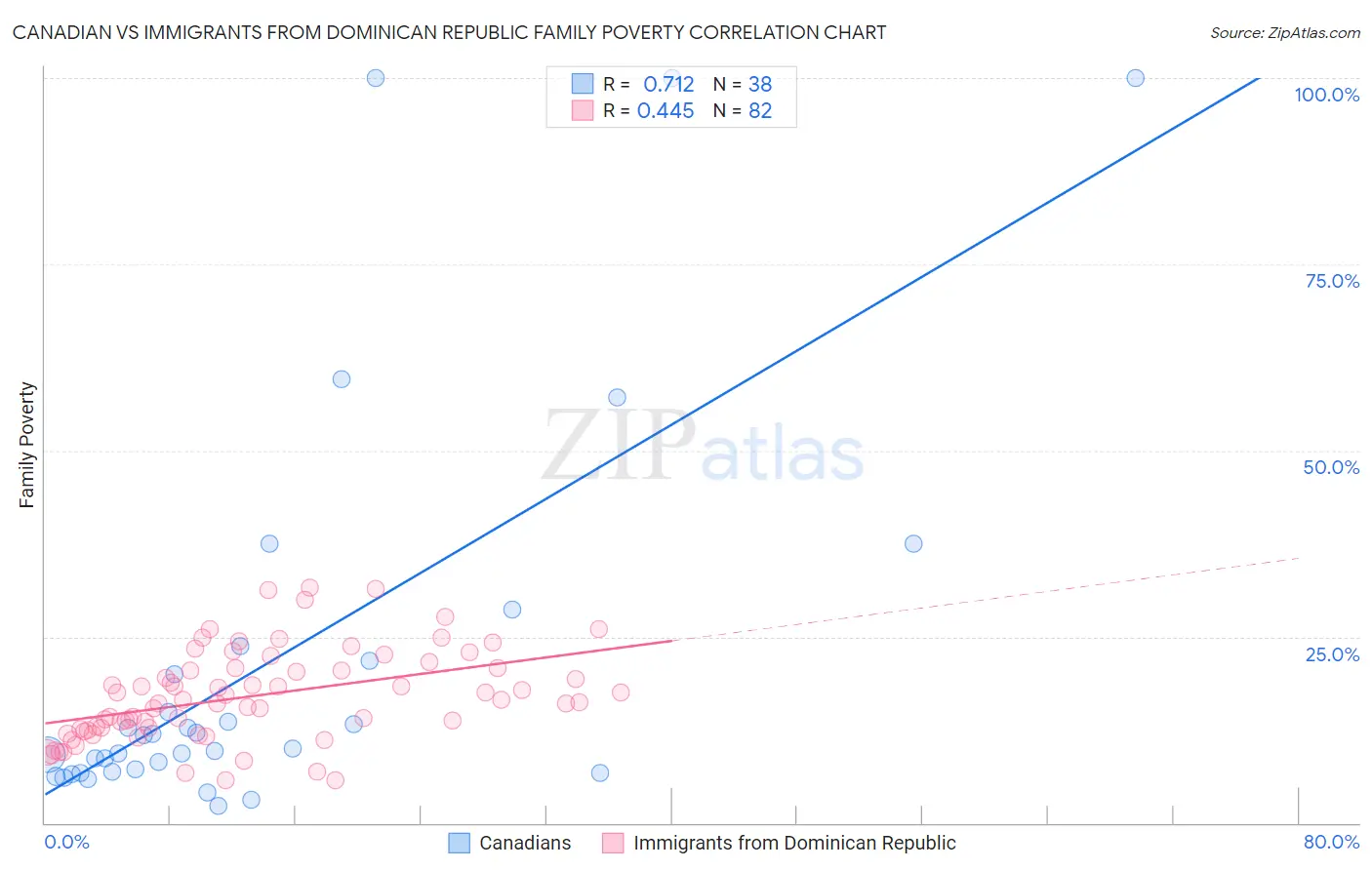 Canadian vs Immigrants from Dominican Republic Family Poverty Correlation Chart