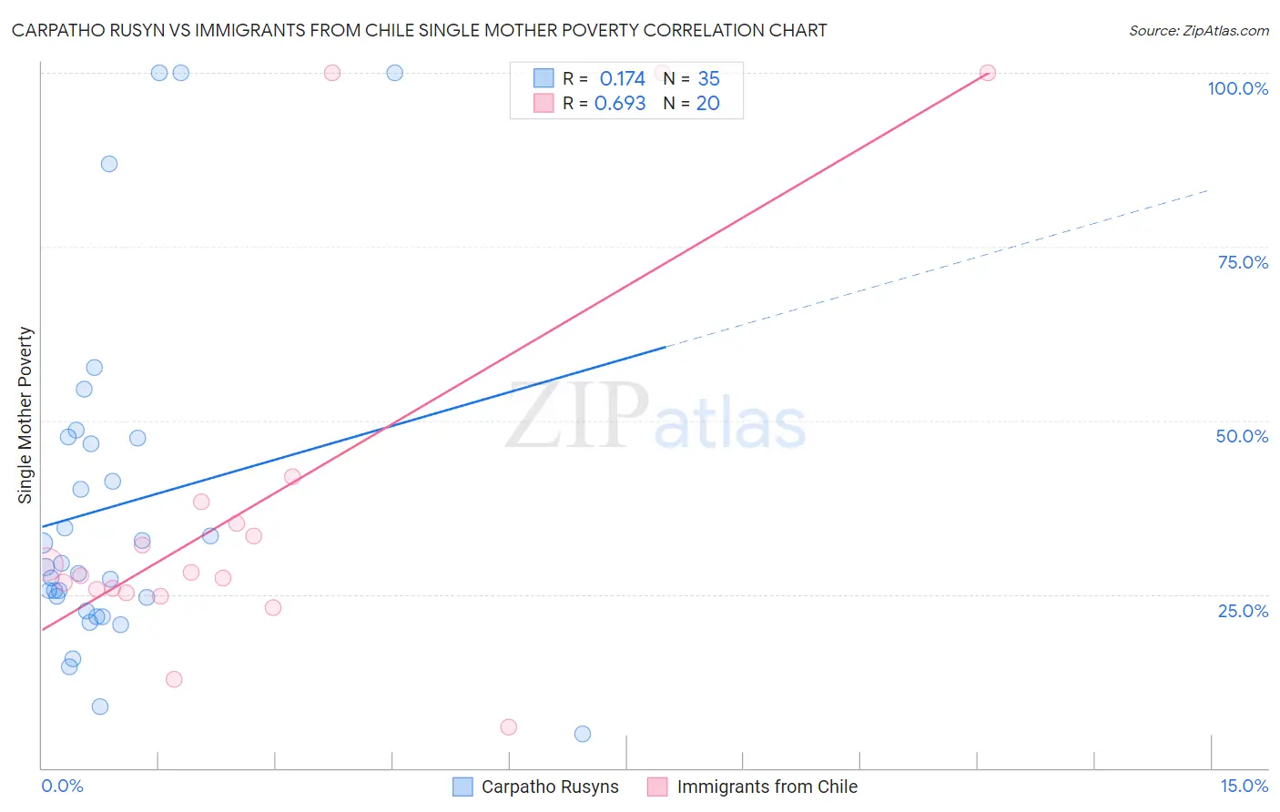 Carpatho Rusyn vs Immigrants from Chile Single Mother Poverty Correlation Chart