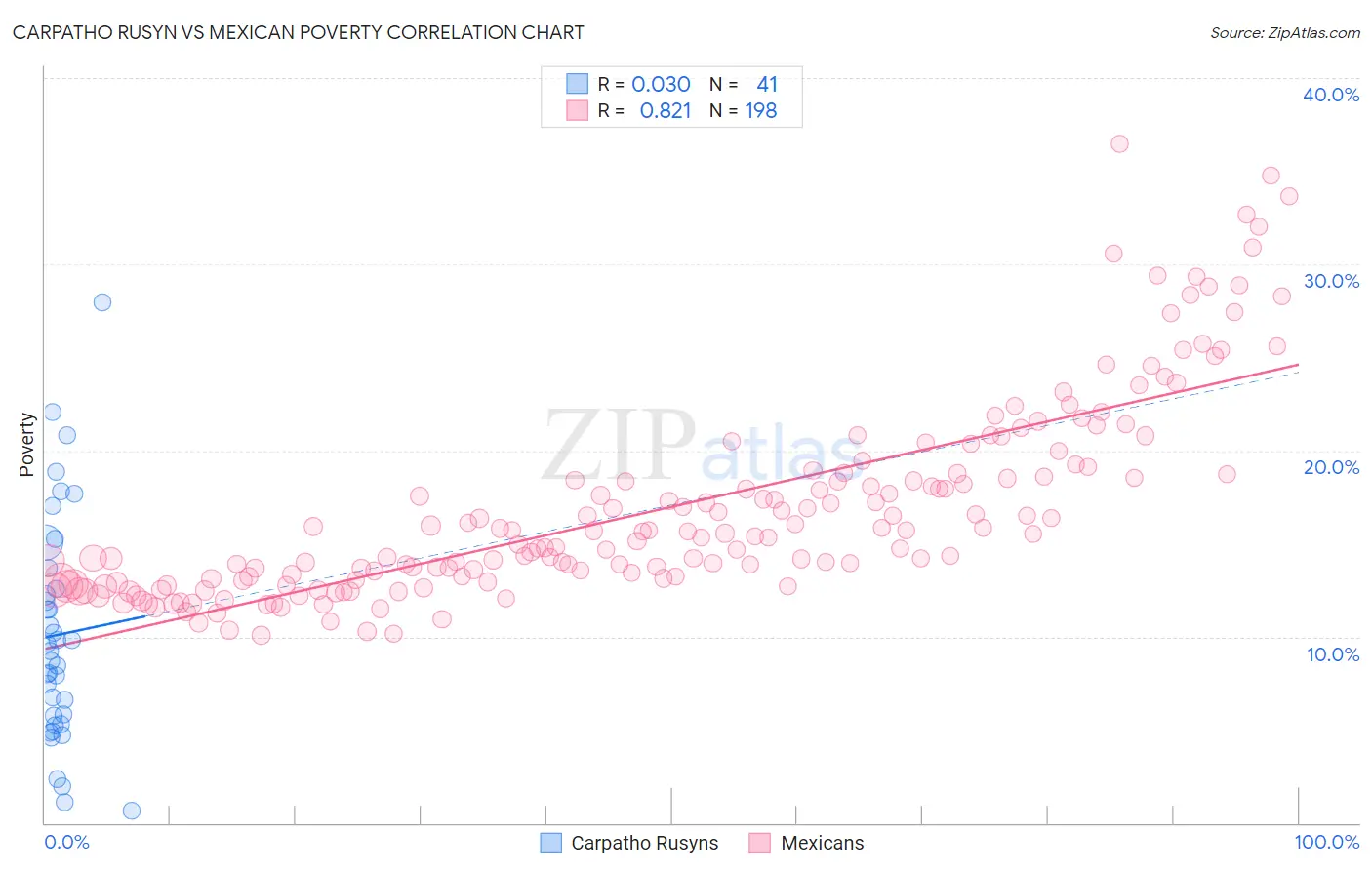The statistical analysis conducted on geographies consisting of 58,869,628 people shows no correlation between the proportion of Carpatho Rusyns and poverty level in the United States with a correlation coefficient (R) of 0.030 and weighted average of 11.3%. Similarly, the statistical analysis conducted on geographies consisting of 564,427,713 people shows a very strong positive correlation between the proportion of Mexicans and poverty level in the United States with a correlation coefficient (R) of 0.821 and weighted average of 15.1%, a difference of 34.1%.