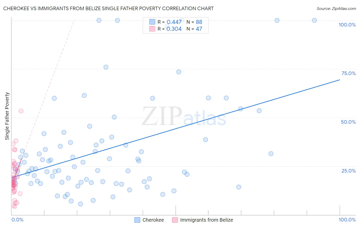 Cherokee vs Immigrants from Belize Single Father Poverty Correlation Chart